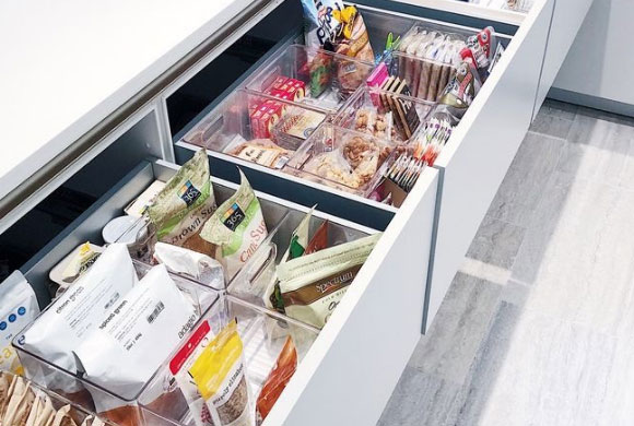 定制橱柜不要忽略了收纳,厨房里的东西比较多,只有做好收纳才不会显得乱糟糟的,建议多装一些拉篮、抽屉、挂件等。拉篮可以根据你家橱柜的空间来选择,比如家里橱柜有高柜的话,可以买一个高柜拉篮。抽屉用来储物非常方便,搭配几个分类格子,就可以分类收纳不同的东西。