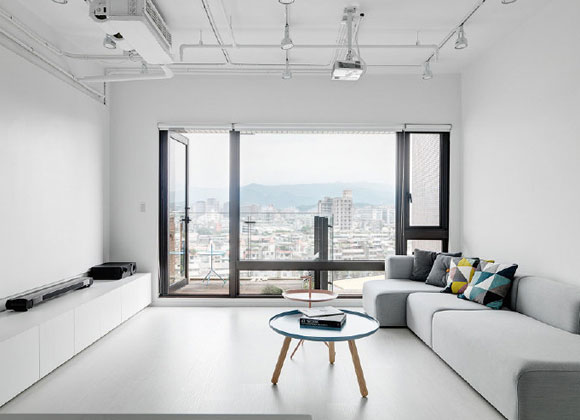 宽敞明亮的客厅,没有去定制满墙的储物柜,白色乳胶漆装饰的墙面,地面铺上白瓷砖,各种线管没有埋进墙体便于日后检修,而是悬挂在顶部,再刷上白色的乳胶漆,与整个空间融为一体。