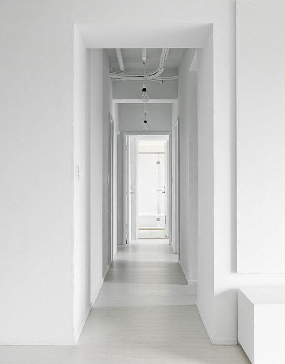 纯白色的过道空间,传统的白炽灯悬挂在过道的上方,是不是有种梦幻般的感觉。