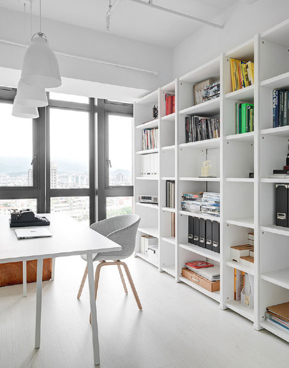 书房的装修效果依然是白色为主,没有柜门的白色大书柜,造型简洁的白色书桌,再配上一张淡灰色的椅子,这样的学习工作环境还真是特别宁静。