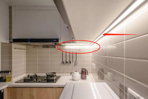 厨房水槽区和操作台上方一定要安装上灯带,晚上切菜看得会更清楚。另外,要记住选择大单槽,比小双槽实用多了。