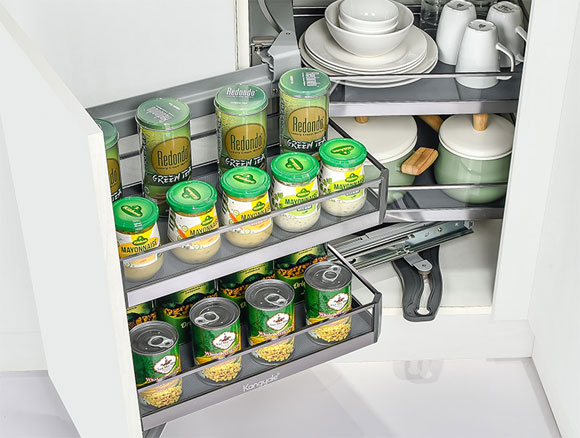 厨房的东西很多,收纳设计一定要仔细规划。可以通过地柜收纳合理规划来解决,相对而言,抽屉的收纳功能要比柜子强大太多。抽屉能更好的利用柜子的垂直空间,可以做成高度不一的抽屉,上浅下深。上面用于收纳筷勺餐具等细小物品,搭配分格收纳盒,一目了然。下面可以收纳使用频率相对低的各种锅具等大件厨房用品。使用抽屉收纳,取放物品的时候拉出抽屉即可,不需要蹲下来钻到柜子里。