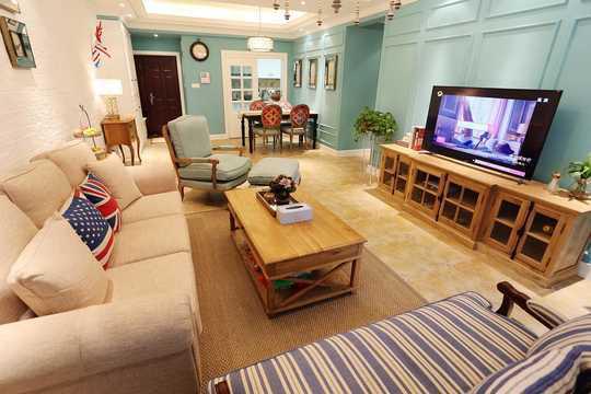客厅全景图,美式风格的实木电视柜,与同色的茶几交相辉映,配合舒适的布艺沙发,浓浓的美式风情。