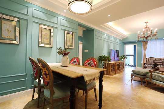 客餐厅一体的布局,通过吊顶进行分隔,墙面色彩沿延客厅的墙面。典型的美式餐桌餐椅,装扮着家居空间,满足家人的用餐需求。