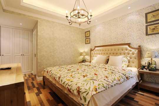卧室风格以法式为主,清新碎花纹的墙纸配合法式的双人床,温馨舒适。造型古朴的欧式吊灯,渲染着大气的吊顶。