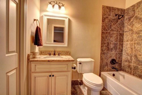 白色的卫浴间营造出一种清爽之美,黑色的柜子和花砖相间铺贴而成墙面的腰线部分。浴室柜是后来才添加到洗面盆底部的,不过正因为高度不合反倒让中间的空余地方成了有用的收纳平台。镜前灯把卫浴间照得透亮,同时也起到了很好的装饰效果。