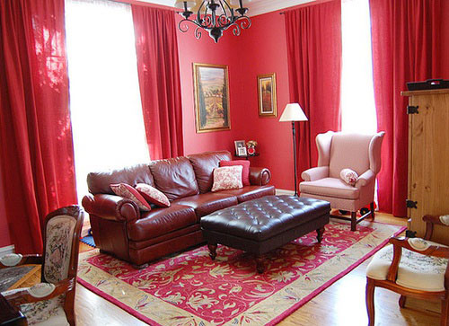 大红色的窗帘,红黄间隔的地毯,深红的沙发,这样的搭配也不错。装修时可以简单的处理,而通过后期的家具、软装等物品的色彩选择来达到红红火火的目的。